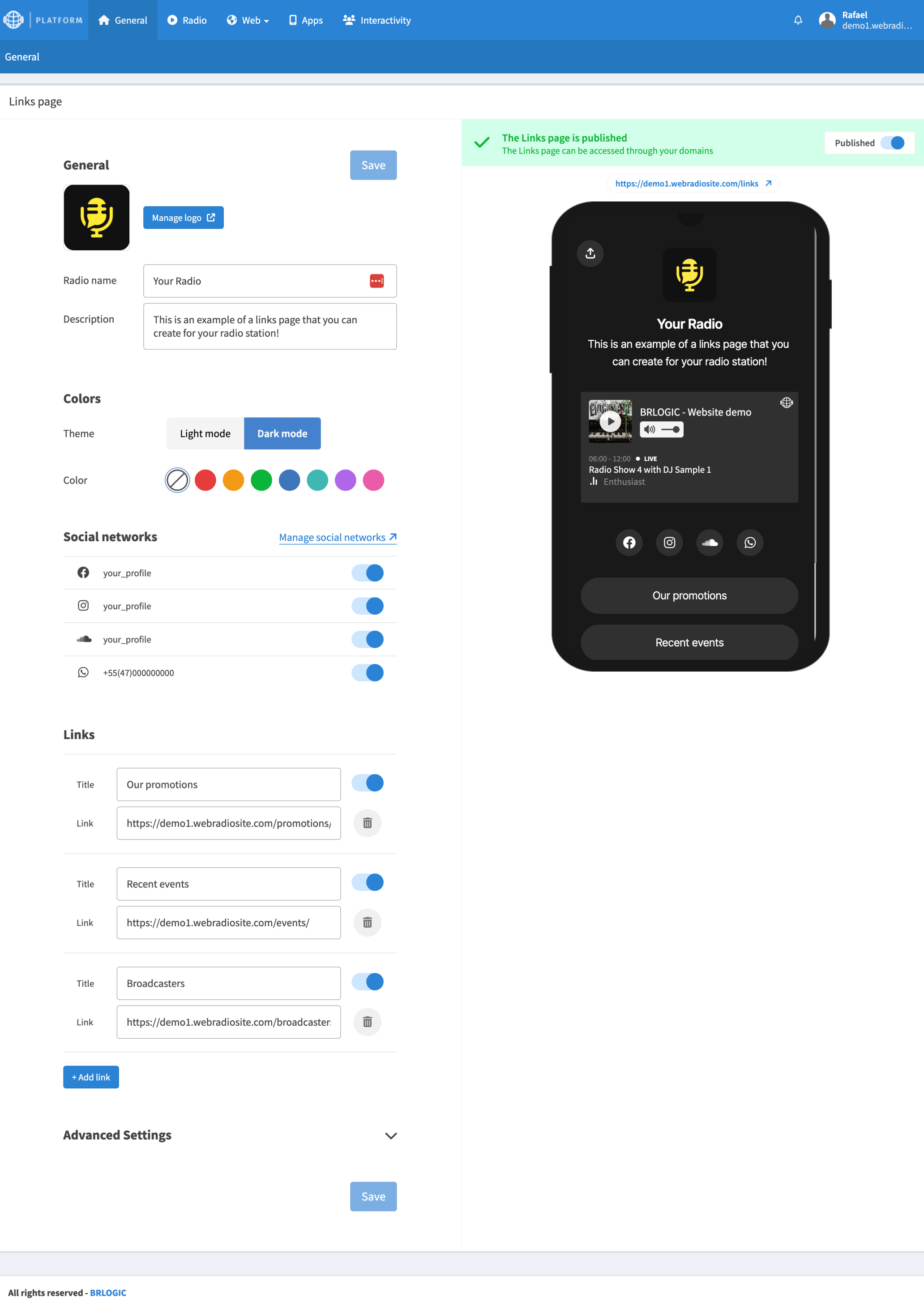 Promote your Instagram, TikTok, X (Twitter), Facebook, WhatsApp, YouTube, radio website and much more on a links page developed for radio stations.